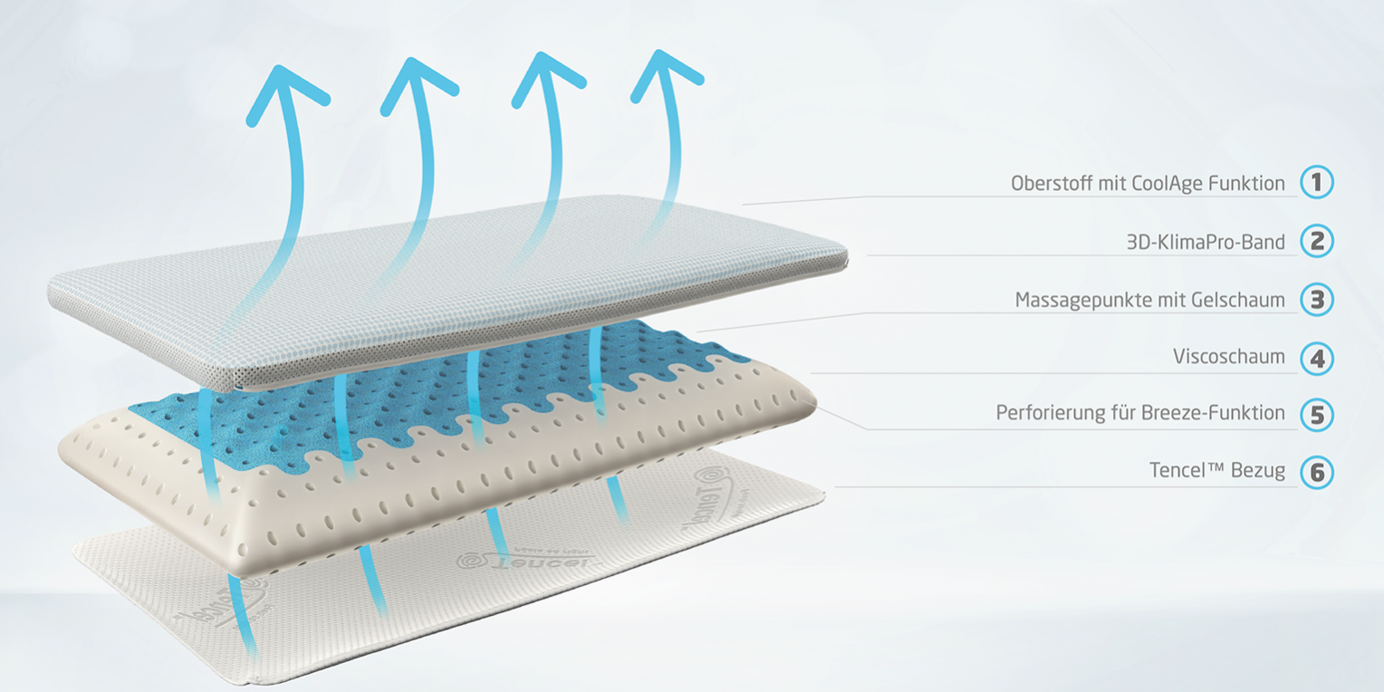 Der spezielle CoolAge® Bezug des Kissens ist mit Viskose und eingearbeiteten Paraffinpartikeln ausgestattet, um aktiv Temperaturspitzen zu reduzieren und für einen angenehmen Klimaausgleich zu sorgen. Der Kern des Kissens besteht aus stabilem Viscoschaum am äußeren Rand und G-Cozy Gel im mittleren Bereich, der mit Luftkanälen für einen spürbaren Stendebach Breeze-Effekt versehen ist. Zusätzlich verfügt das Kissen über integrierte Massagepunkte auf der Oberseite, die das vegetative Nervensystem im Nackenbereich stimulieren und entspannen, was zu einem erholsamen Schlaf beiträgt. Die geringe Oberflächenspannung bietet zudem einen Anti-Aging-Effekt. Der hautsympathische TENCEL™-Bezug auf der Unterseite des Kissens sorgt für zusätzlichen Komfort und bietet ein hohes Maß an Hygiene.